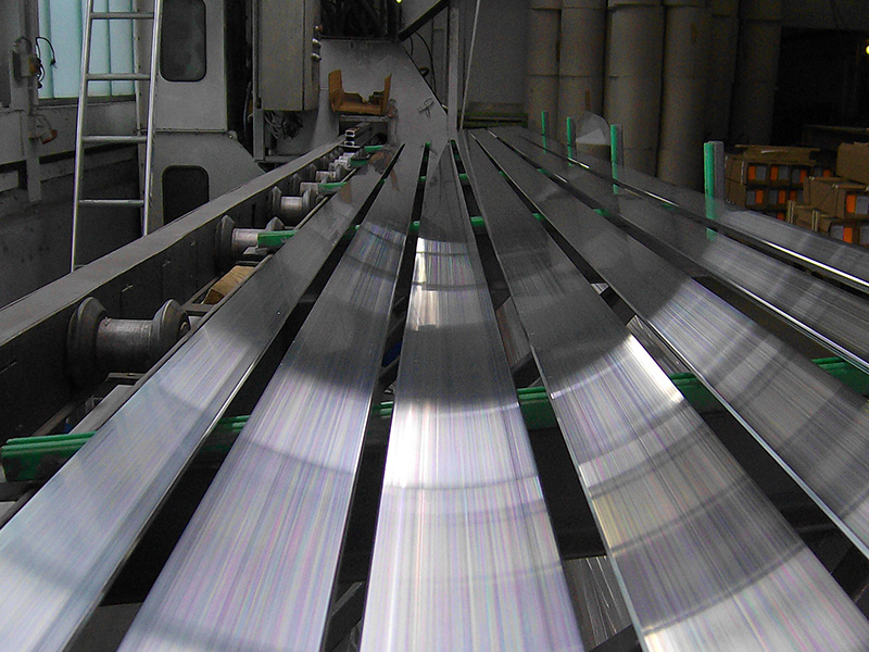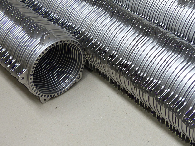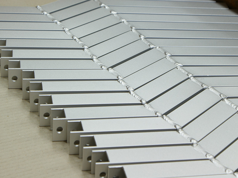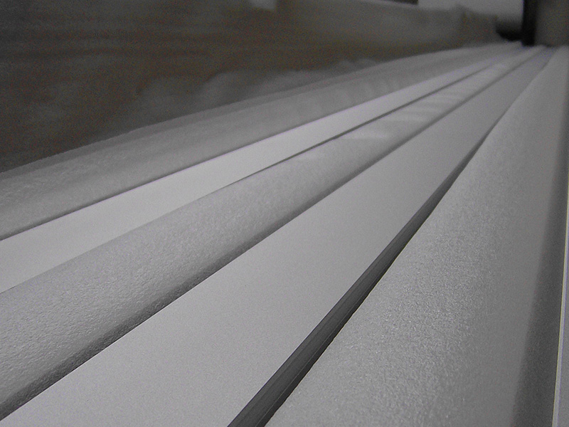 Aluminiumbauteile mit diversen Bearbeitungsspuren und Stegabzeichnungen können im Edelstahlstrahlverfahren egalisiert werden. Um eine perfekte gleichmäßige satinierte Oberfläche zusätzlich erzielen zu können, sollte in Kombination zum Strahlverfahren eine anschließende Eloxierung erfolgen.